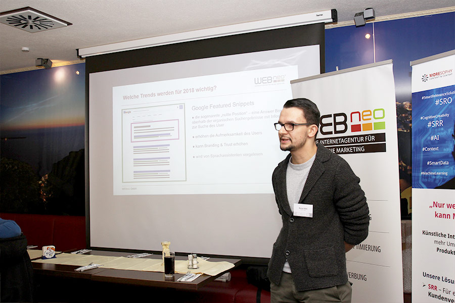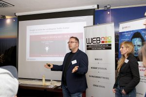 Nun hatte auch der Letzte seinen Platz gefunden und Ronny Stöck konnte seinen vor der Leinwand einnehmen und mit dem ersten Vortrag des Abends beginnen. Er ist Senior Online Marketing Spezialist bei der WEBneo GmbH. Für alle die, die Dresdner Internetagentur noch nicht kannten, zeigte er in welchen Themenbereichen die Full-Service-Agentur unterwegs ist.